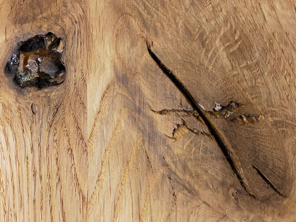重厚で堅く、木目が真っすぐで独特の存在感があります。独自の繊維構造から、柾目で製材すると虎斑(とらふ)という虎の背中の縞模様に似た銀色に輝く杢目が現れ、個性豊かな表情を楽しめます。飛騨産業では主に樹齢100年前後の北米産ホワイトオーク材を使用しています。※曲木部分など一部ナラ材を使用している場合があります。