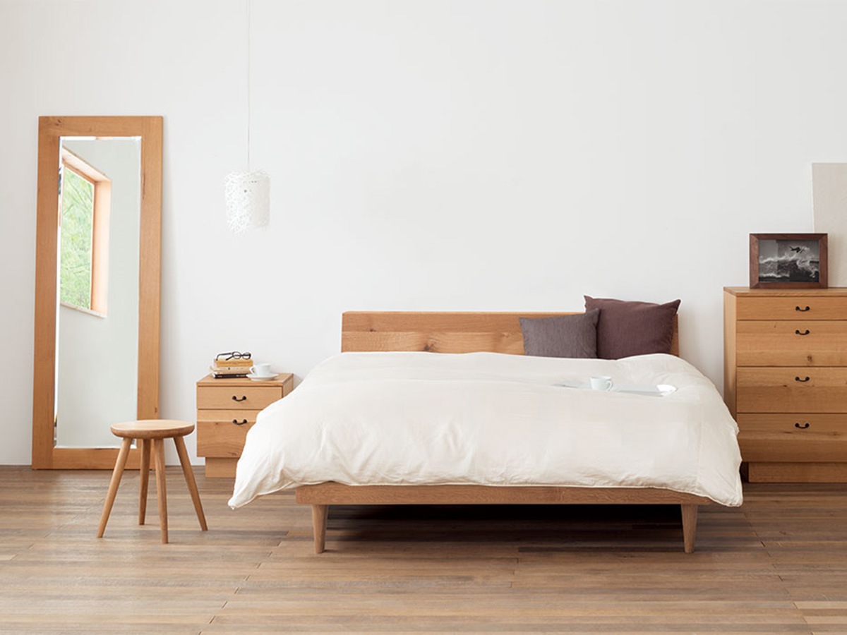 重厚で堅く、木目が真っすぐで独特の存在感があります。独自の繊維構造から、柾目で製材すると虎斑(とらふ)という虎の背中の縞模様に似た銀色に輝く杢目が現れ、個性豊かな表情を楽しめます。飛騨産業では主に樹齢100年前後の北米産ホワイトオーク材を使用しています。※曲木部分など一部ナラ材を使用している場合があります。