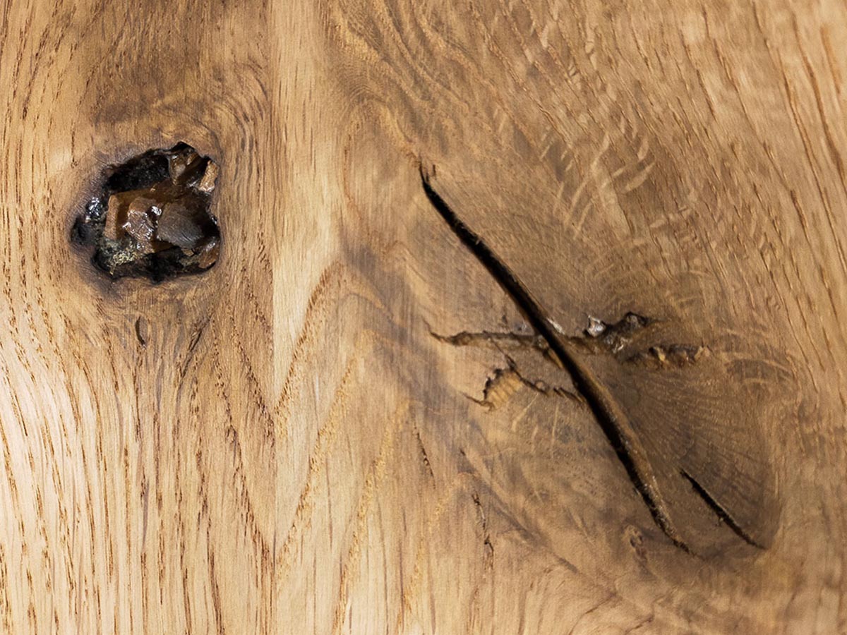 化粧合板などとは違い、天然木の木目や色味は様々です。 「木」と一言に言っても、その表情は様々。 例えば、一本の幹の中でも「心材」と呼ばれる幹の中心部は色が濃く、「辺材」と呼ばれる外側の部分は薄く、心材とは色が異なります。また、木は光合成をするために枝葉をたくさん伸ばすので「節」が現れたりもします。 飛騨産業ではこのような木材の様々な表情を活かした家具づくりを行っています。