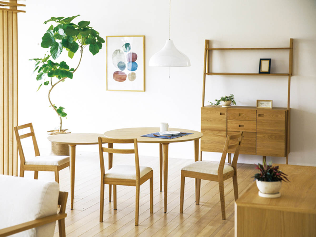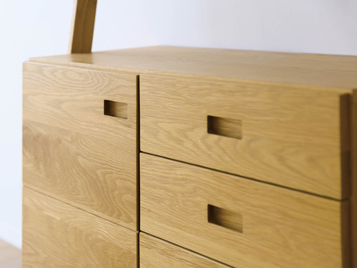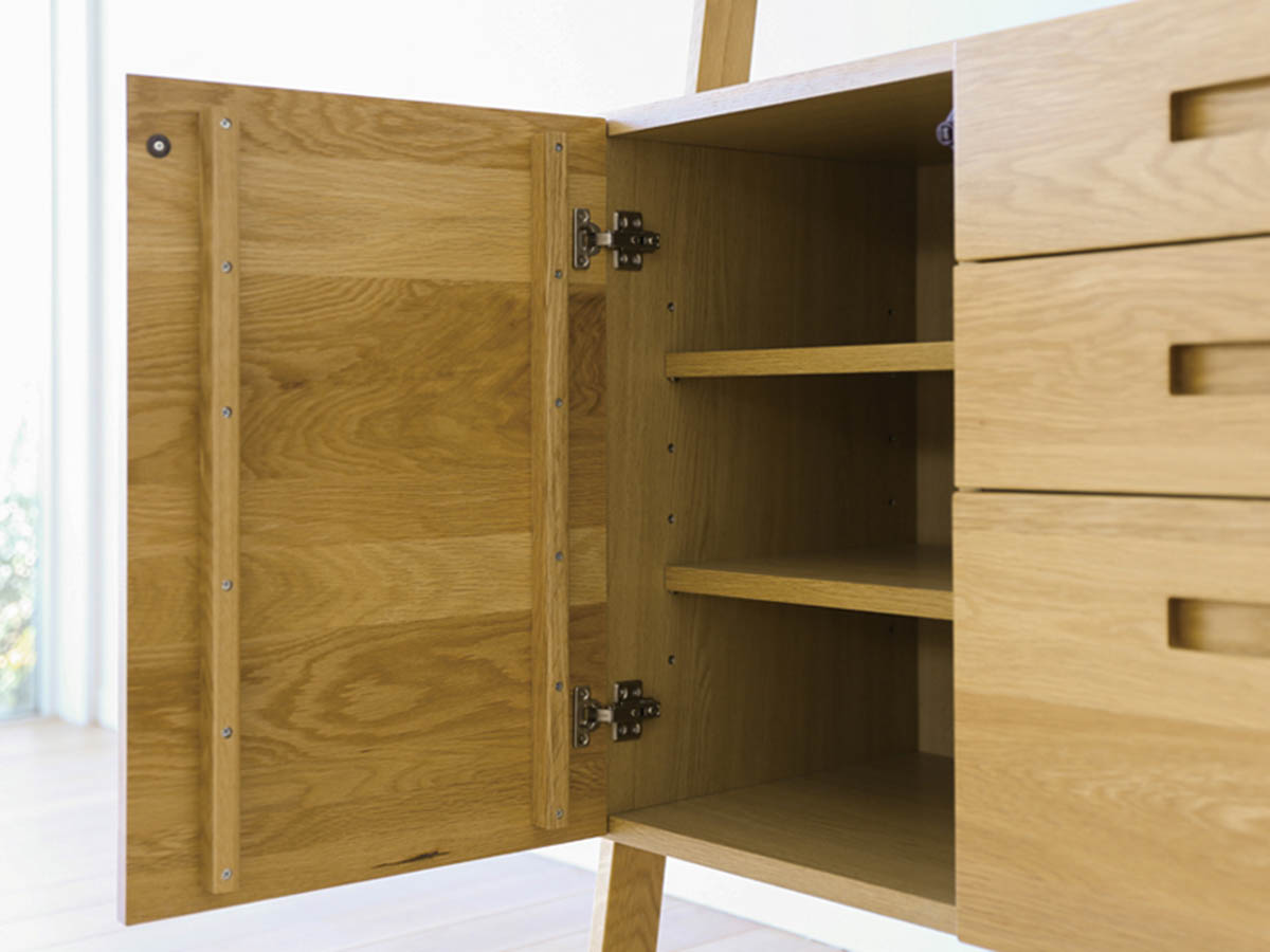 重厚で堅く、木目が真っすぐで独特の存在感があります。独自の繊維構造から、柾目で製材すると虎斑(とらふ)という虎の背中の縞模様に似た銀色に輝く杢目が現れ、個性豊かな表情を楽しめます。 ナチュラルカラーで仕上げられているのでオーク材の木目や質感を味わって頂けます。明るい木肌のまま仕上げられているので明るいお部屋のコーディネイトに適しています。