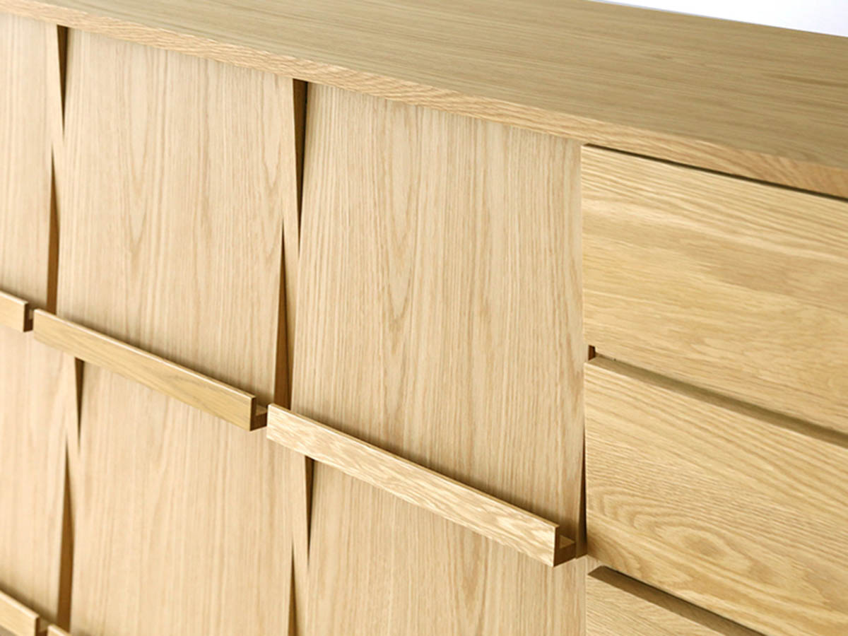 重厚で堅く、木目が真っすぐで独特の存在感があります。独自の繊維構造から、柾目で製材すると虎斑(とらふ)という虎の背中の縞模様に似た銀色に輝く杢目が現れ、個性豊かな表情を楽しめます。 ナチュラルカラーで仕上げられているのでオーク材の木目や質感を味わって頂けます。明るい木肌のまま仕上げられているので明るいお部屋のコーディネイトに適しています。