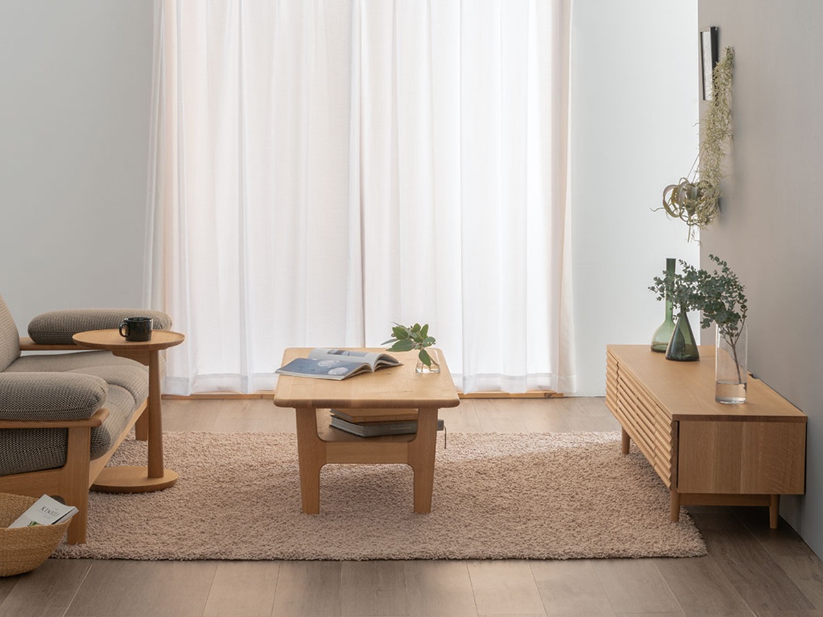 重厚で堅く、木目が真っすぐで独特の存在感があります。独自の繊維構造から、柾目で製材すると虎斑(とらふ)という虎の背中の縞模様に似た銀色に輝く杢目が現れ、個性豊かな表情を楽しめます。飛騨産業では主に樹齢100年前後の北米産ホワイトオーク材を使用しています。※曲木部分など一部ナラ材を使用している場合があります。