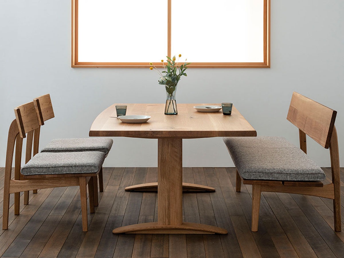 重厚で堅く、木目が真っすぐで独特の存在感があります。独自の繊維構造から、柾目で製材すると虎斑(とらふ)という虎の背中の縞模様に似た銀色に輝く杢目が現れ、個性豊かな表情を楽しめます。飛騨産業では主に樹齢100年前後の北米産ホワイトオーク材を使用しています。※曲木部分など一部ナラ材を使用している場合があります。