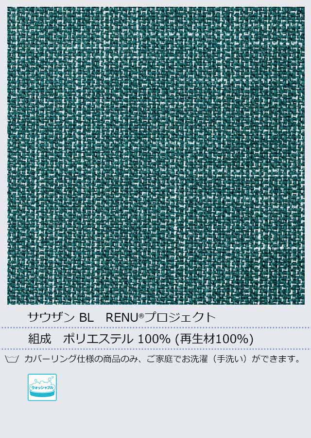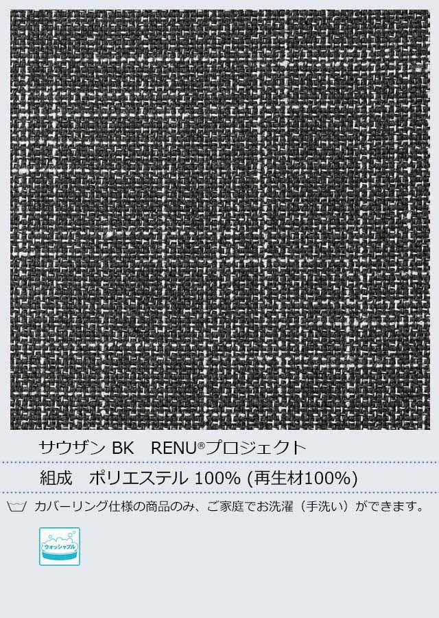 廃棄された生地等が原料の“RENU®”と回収ペットボトルから作られた糸を使用。環境に配慮した再生材100%の布で、CO2廃棄削減に繋がります。先染め織物で深みのある表情です。